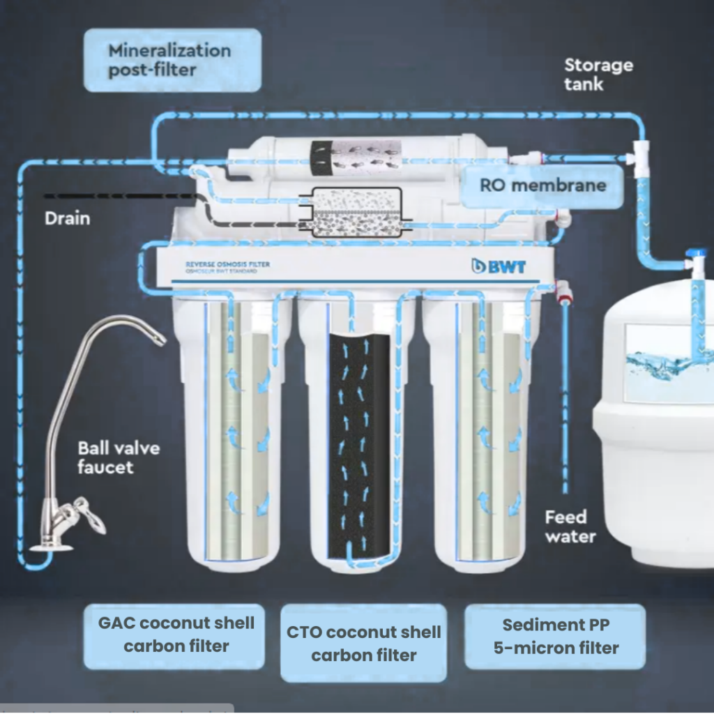 - Your New BWT RO is highly effective at removing unwanted elements from your water that may include minerals or chemicals that can affect the taste and smell of the your water including sodium, fluoride and chloride, plus many more.